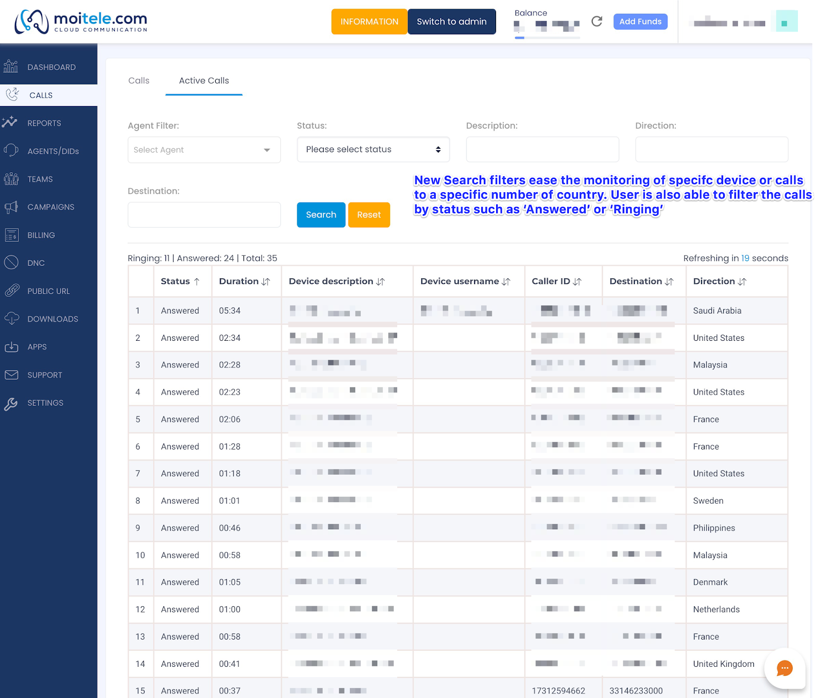 Calls section on customer portal4. On the "Active Calls" section, users can filter calls from specific agents, through call status and destination