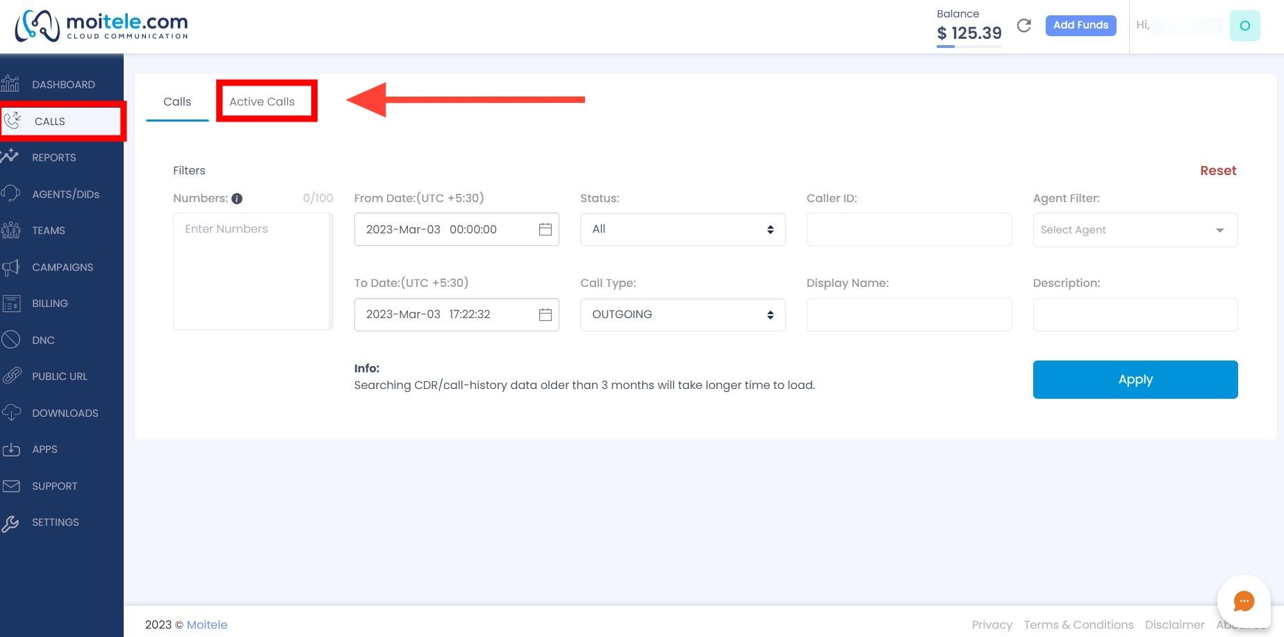 Moitele customer portal login3. Navigate to the calls section from the left-hand side panel and click on "Active Calls"