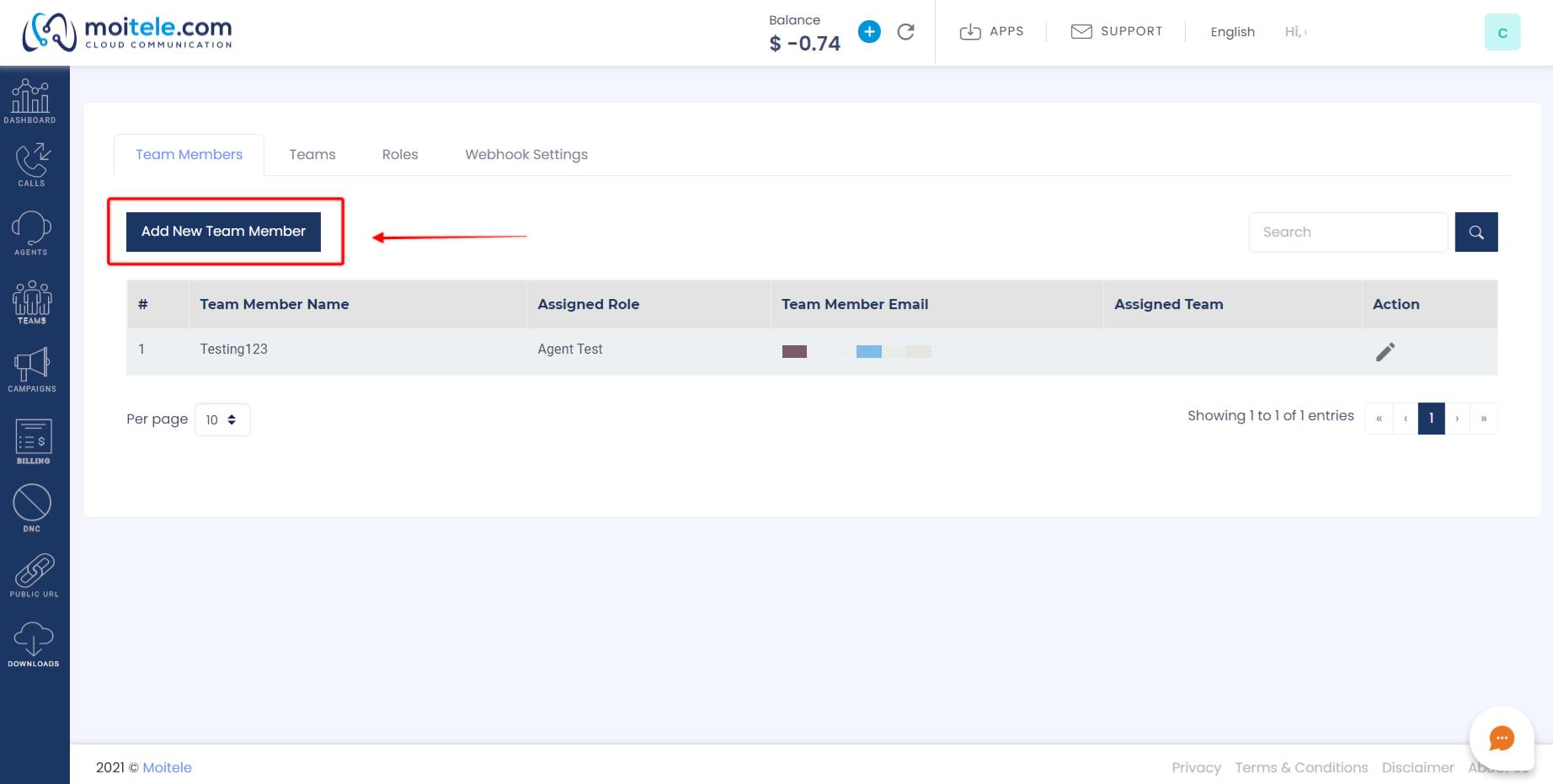 The teams section in Moitele Customer Portal allows users to manage adding new team members, add them to teams, assign them roles and manage webhook settings.